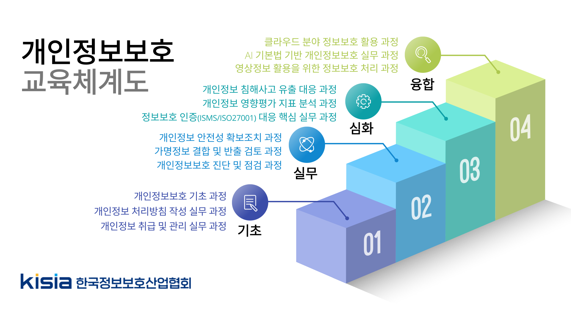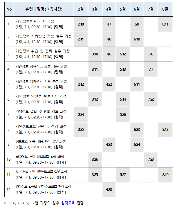 집체교육(현장훈련) : 6개 과정(개인정보보호 기초 과정, 개인정보 처리방침 작성 실무과정, 개인정보 취급 및 관리 실무 과정, 개인정보 침해사고 유출 대응 과정, 클라우드 분야 정보보호 활용 과정, AI기본법 기반 개인정보보호 실무 과정)