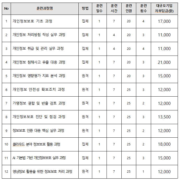 (총 12개 과정) 개인정보보호 기초(현장훈련) , 개인정보 처리방침 작성 실무(현장훈련), 개인정보 취급 및 관리 실무(현장훈련), 개인정보 침해사고 유출 대응(현장훈련), 개인정보 영향평가 지표 분석(원격훈련), 개인정보 안전성 확보조치(원격훈련), 가명정보 결합 및 반출 검토 과정(원격훈련), 개인정보보호 진단 및 점검 과정(원격훈련), 정보보호 인증 대응 핵심 실무 과정(원격훈련), 클라우드 분야 정보보호 활용(원격훈련), AI 기본법 기반 개인정보보호 실무 과정(원격훈련), 영상정보 활용을 위한 정보보호 처리과정(원격훈련)